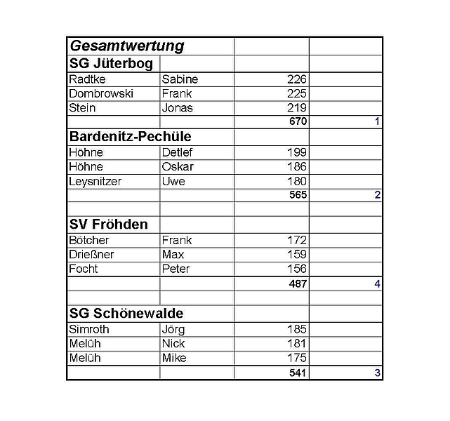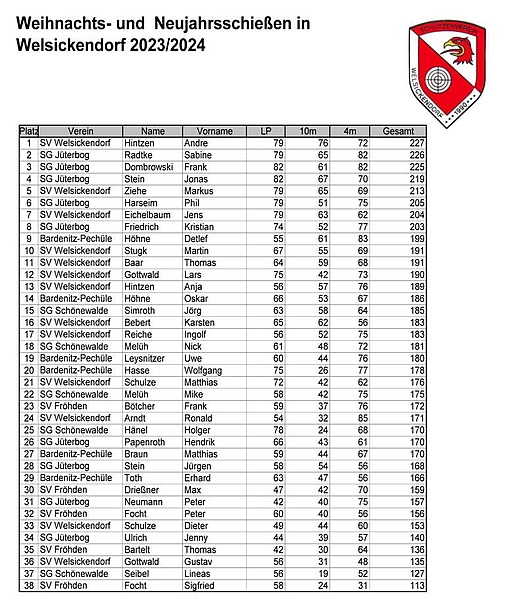 Im Einzelwettbewerb konnte sich André Hintzen vom SV Welsickendorf mit 227 Ringen knapp mit jeweils einem Ring Vorsprung gegen Sabine Radtke und Frank Dombrowski von der SG Jüterbog durchsetzen. Unsere Teilnehmer konnten im Wertungsschießen gute Platzierungen erreichen. So belegt Detlef Höhne den 9. Platz mit 199 Ringen. Sein Sohn Oskar erreichte die zweitbeste Platzierung für unseren Verein mit dem 14. Platz und sehr guten 186 Ringen. Gemeinsam mit Uwe (180 Ringe) konnten wir in der Mannschaftswertung den 2. Platz hinter den Jüterboger Schützen erreichen.