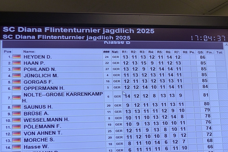 Am 10.05. machten sich Wolfgang und Frank auf den Weg zum diesjährigen Flintenturnier des SC Diana Hoppegarten. In Hoppegarten herrschten hervorragende Bedingungen auf der Anlage. Insgesamt meldeten sich 39 Teilnehmer vorwiegend aus dem gesamten norddeutschen Raum an. Bemerkenswert war, dass die Jägerschaft dabei äußerst stark vertreten war. Unsere Teilnehmer schienen wohl die einzigen Sportschützen im Wettbewerberfeld gewesen zu sein.