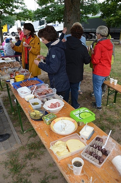 Am Bus erwartete uns Wolfgang bereits mit einem kleinen Würstchen-Imbiss zur Stärkung für den nächsten Programmpunkt. Dazu begaben wir uns in den Warener Yachthafen zu einer 1,5-stündigen Rundfahrt auf der Müritz und einem Teil der Seitenarme. Das Wetter hat sich gut gehalten, so dass die meisten einen Platz auf dem Oberdeck bevorzugten. Die „steife Brise“ wurde nicht als störend empfunden. Viele nutzten den Aufenthalt auch für ein Bierchen, ein Fischbrötchen oder einen Eisbecher.