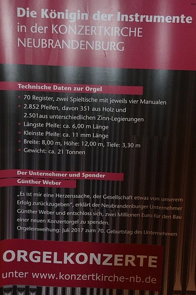 Besonders erwähnenswert ist auch die kulturelle Szene in der Stadt. Neben einem Schauspielhaus nimmt dabei die Konzertkirche, die ehem. Marienkirche, eine besondere Stellung ein. Die Umgestaltung des Innenraumes im Rahmen eines Architekturwettbewerbes brachte dem finnischen Architekten Pekka Salminen den 2. Preis in einem Weltarchitekturwettbewerb ein. Und das mit Recht. Davon konnten wir uns bei der Besichtigung überzeugen. Der Saal zeichnet sich besonders durch seine exzellente Akustik aus. Die Orgel, die von Fa. Schuke aus Potsdam erbaut worden ist, fügt sich sehenswert in die Architektur des Saales ein. Das Objekt wird regelmäßig für Konzerte von Rock bis Klassik genutzt, die immer ein besonderes Erlebnis für die Gäste sind.