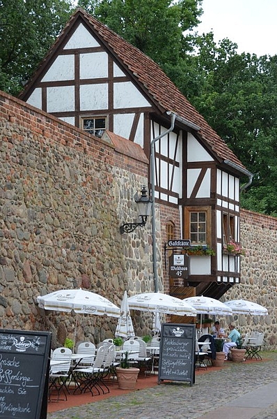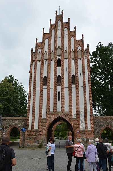 In Neubrandenburg wurden wir dann von den zwei Stadtführerinnen bereits erwartet. Anschließend machten wir uns in zwei Gruppen auf zur Besichtigung der Stadt, die bereits im Jahr 1248 erstmals urkundlich erwähnt worden war. Von der bewegten Zeit im Mittelalter sind die einstige 7 Meter hohe Stadtmauer und die 4 Stadttore noch erhalten. Das Stargarder Tor haben wir uns im Rahmen der Führung näher angesehen. Schön waren auch die in die Stadtmauer integrierten sogenannten Wiekhäuser.