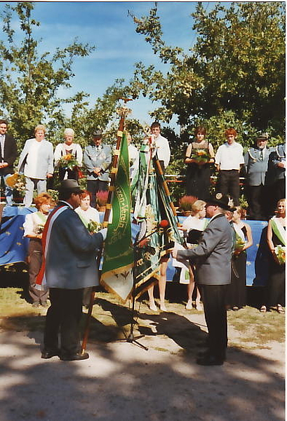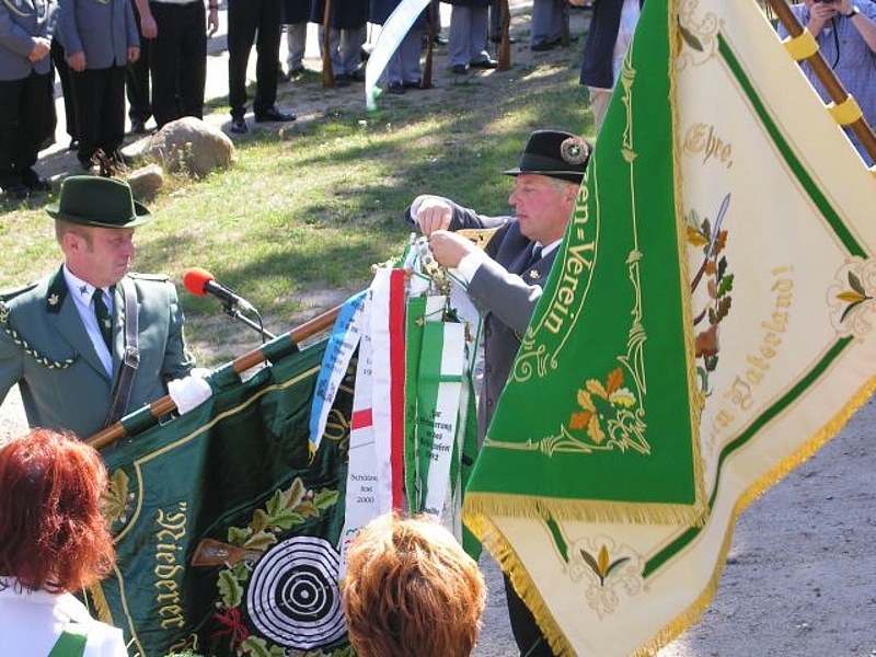 Daran anschließend stand eine besondere Zeremonie auf dem Programm. Die alte Vereinsfahne, die durch den Einsatz und die Präsentation zu zahlreichen Festen und Veranstaltungen inzwischen doch erheblich gelitten hat, konnte und sollte nicht weiter strapaziert werden. Und so wurde im vergangenen Jahr im Verein der Beschluss gefasst, eine neue Fahne anzuschaffen. An dieser Stelle gilt unser besonderer Dank allen Vereinsmitgliedern und der Gemeinde Bardenitz, die den Hauptteil der Finanzierung übernommen haben. Der Präsident des Brandenburgischen Schützenbundes Rainer Wickidahl kam der Bitte des Vorstandes gern nach und führte die Fahnenweihe für die neue Vereinsfahne durch. Die erforderliche geweihte Fahne stellte der Schützenverein Niederer Fläming aus Fröhden zur Verfügung. Damit stand der Weihe nichts mehr im Wege. Diese wurde dann durch Rainer Wickidahl in feierlicher und würdiger Form vorgenommen. Zum Abschluss dieser Zeremonie wurde noch ein Kanonenschuss aus der „Johanna“ von den Fröhdener Schützen abgegeben.