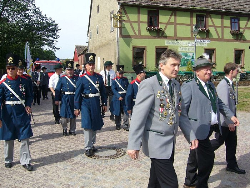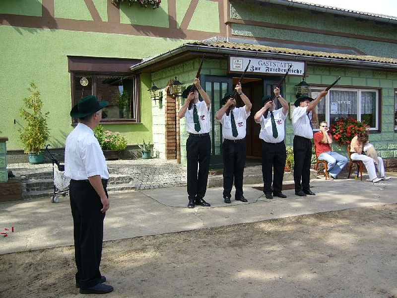 Am Samstag früh trafen sich die Vereinsmitglieder und zahlreiche Gäste erst zum Umtrunk beim neuen Schützenkönig, Norbert Höhne in Pechüle. Hier erwarteten uns neben einem kleinen Imbiss und Getränken auch das Jüterboger Original Orgel-Raimund. Nach dem Übergeben der Königsscheibe und einem Salutschießen rückten alle zunächst beim neuen König zu einer kleinen Stärkung ein. Sehr herzlich war dann die Begrüßung des Spielmannszuges Neuseddin, der uns in diesem Jahr zum 10. Mal begleitete. Besonderen Anklang bei den Gästen fanden die Darbietungen des Cheerleadernachwuchses.